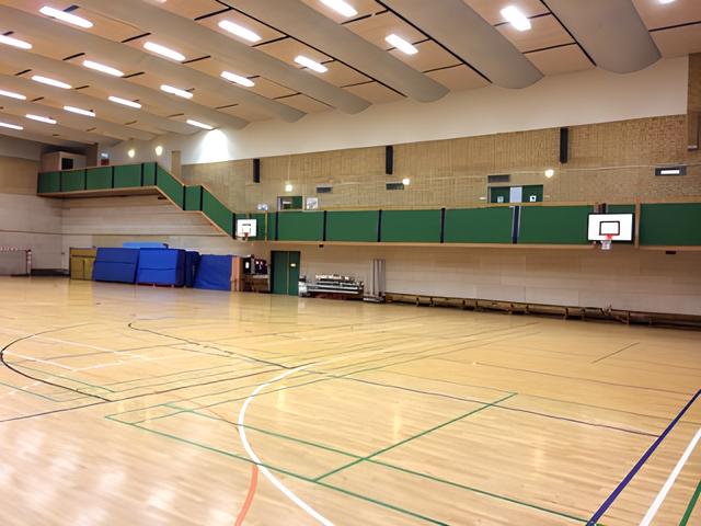 Hallen: Håndboldbane, badmintonbaner, vollyballbaner og basketbaner.